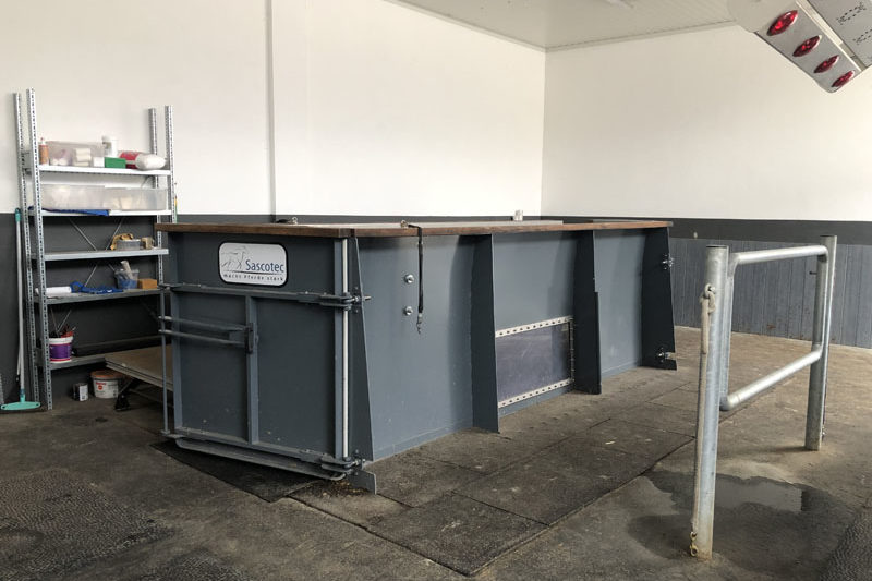 Der moderne Aquatrainer „Sascotec“ ist ein ebenerdiges Laufband, das mit Wasser geflutet wird, um die Pferde geradeaus auf hartem Boden schonend gegen den Wasserwiderstand zu trainieren. Daher ist der Aquatrainer neben dem ergänzenden Training von Reitpferden vor allem für die gesundheitliche Rehabilitation geeignet. Er kann die Heilung nach Operationen, Knochenbrüchen und Sehnenverletzungen gezielt unterstützen und verschafft Linderung bei Rückenproblemen und Gelenksentzündungen.